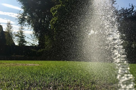 Nachdem Du den Rasensamen mit einem Streuwagen in der richtigen Menge ausgebracht hast geht's jetzt mit dem Bewässern weiter. Feuchte den Boden an, damit des Saatgut Auflaufen sprich Keimen kann. Durch das Wasser wird der Rasensamen quasi aktiviert.