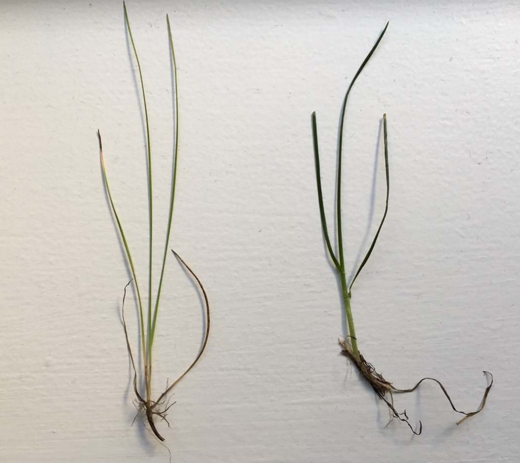 In den vergangenen zwei Jahren habe ich neben der Riby-Taylor R9 auch die R8 von Rigby-Taylor ausprobiert. Die R8, die zusätzlich Festuca enthält, sorgt für einen noch dichteren Rasenteppich. Es ist erstaunlich, wie die Festuca selbst die kleinsten Lücken im Rasen ausfüllt und ihm ein sattgrünes Finish verleiht. Im Bild sehr ihr den Vergleich Festuca <> Ultrafines Lolium.